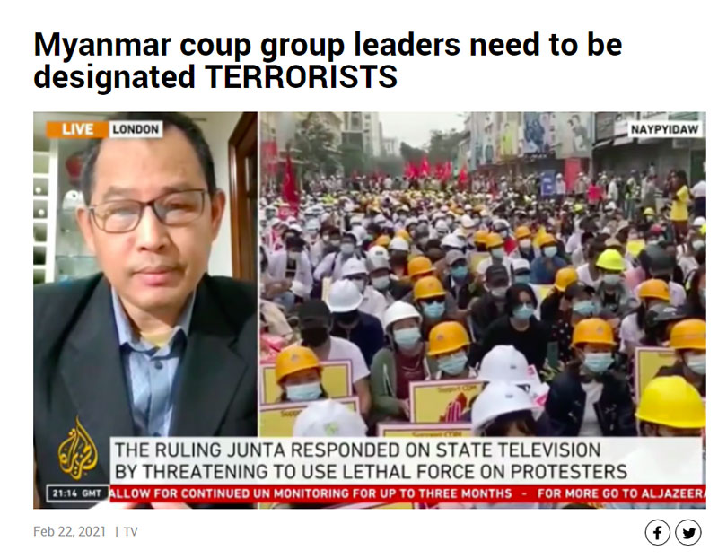 The least these governments and inter-state organizations and bloc can do is to call a spade a spade. Myanmar’s national armed forces has since the February coup, engaged in textbook terrorism against the country’s population, both majority and minority communities. These national governments and world bodies should respect the Burmese public’s popular view of the military under Min Aung Hlaing a terrorist-mafia.