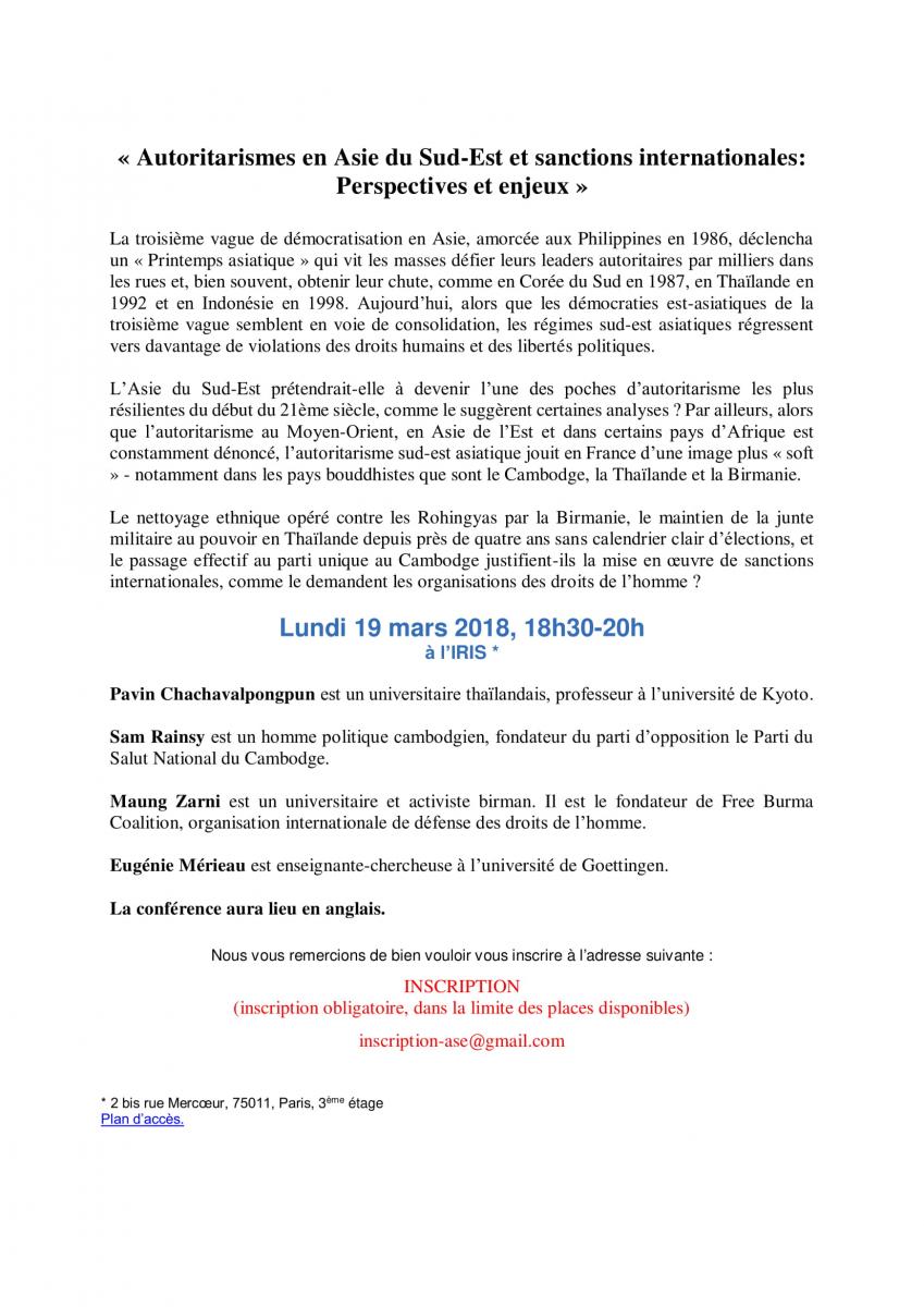 International Mobilization Against Authoritarian Regimes: Thailand, Cambodia and Burma, The French Institute for International and Strategic Affairs, 19 March 2018